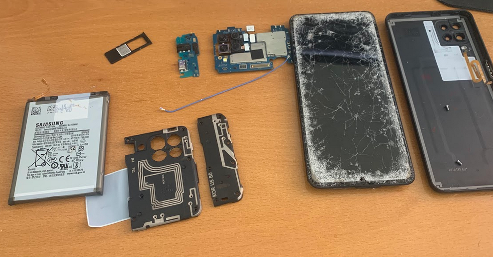 The screen is in bad shape, but when I got home, I plugged it in and it seems to power up, which is a good sign. I deconstructed it, and found that most components are in excellent shape, even the battery, which does not show any signs of mechanical damage. The camera’s logic board (top, middle, with the 4 cameras) is undamaged.