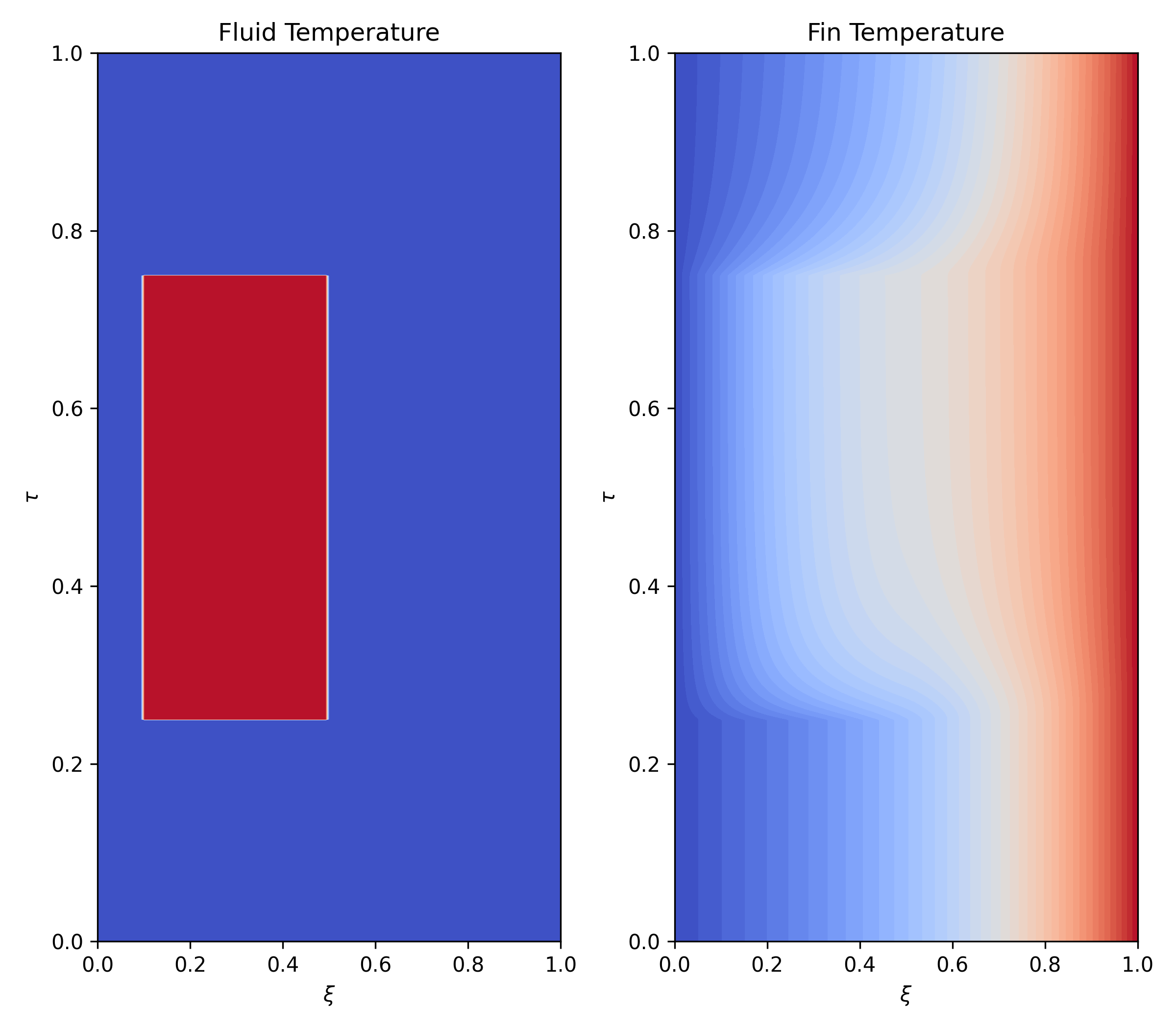 You can create cool things like this, which is a contour plot of heat across (x-axis) a 1-d fin (right) exposed to a fluid whose temperature varies with time (left), with constant temperature boundary condition. This is a solution to a time-varying (y-axis) heat equation of such a system.